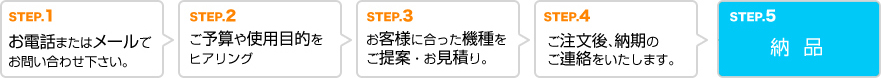 事前に使用目的をお聞きし、目的にあった機種をご提案いたします。個人用か業務用か、どのような目的で使われるか、法人様であれば社内の使用環境も考慮し、最適機種をお探ししお見積りいたします。